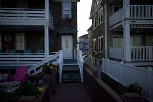 A tranquil photograph captures a quaint entrance framed by neighboring homes, suggesting a close-knit community atmosphere. Soft evening light casts a gentle glow on the white door, while vibrant flowers add a touch of warmth to the scene. The overall mood evokes a sense of calm and welcoming, inviting the viewer to imagine the stories unfolding within.