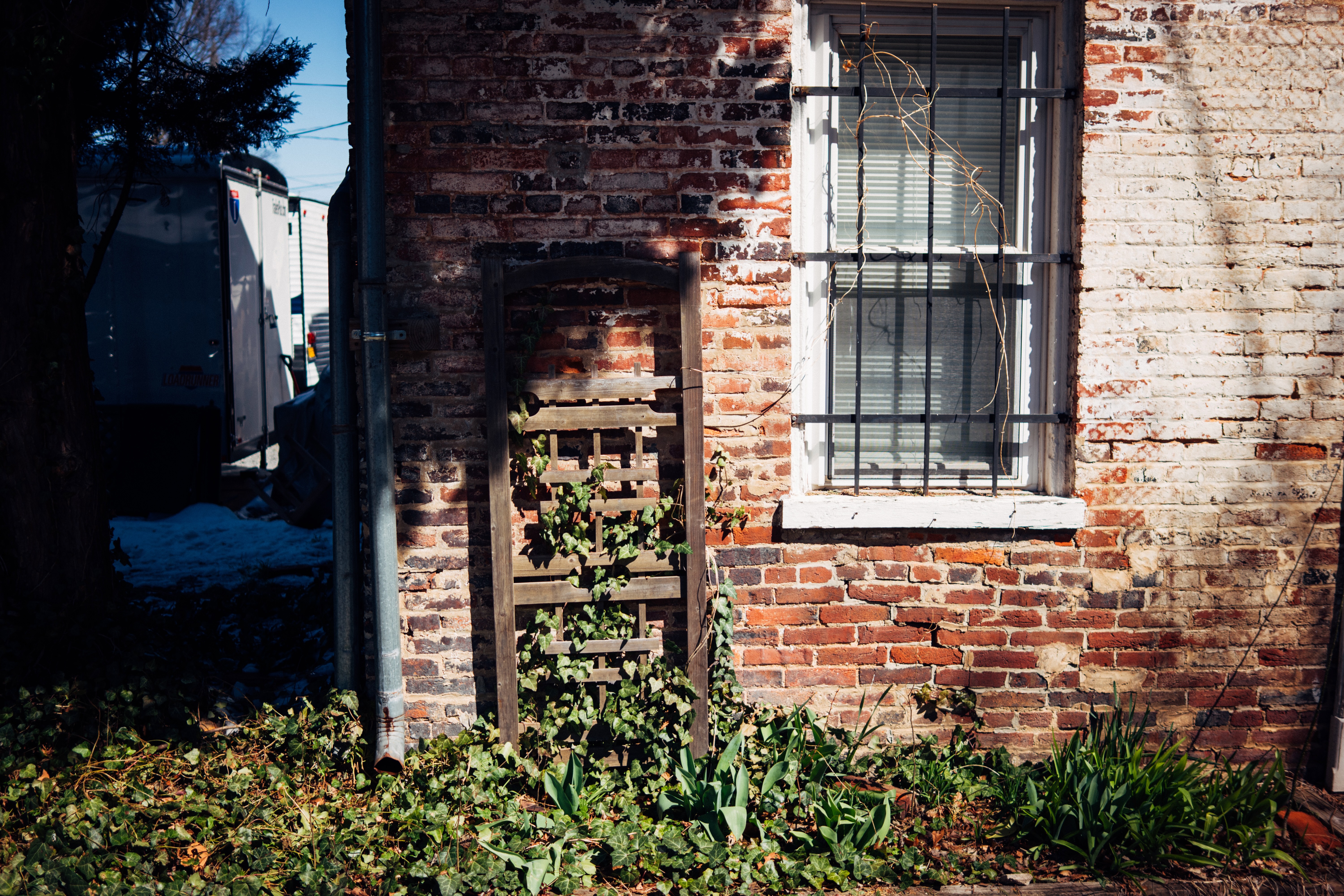 This photograph captures a weathered brick wall adorned with creeping ivy, creating a juxtaposition of nature and urban architecture. The soft morning light bathes the scene in warmth, highlighting the textures of the bricks and the weathered trellis. A sense of tranquil decay permeates the atmosphere, inviting contemplation on the passage of time in this tucked-away corner.