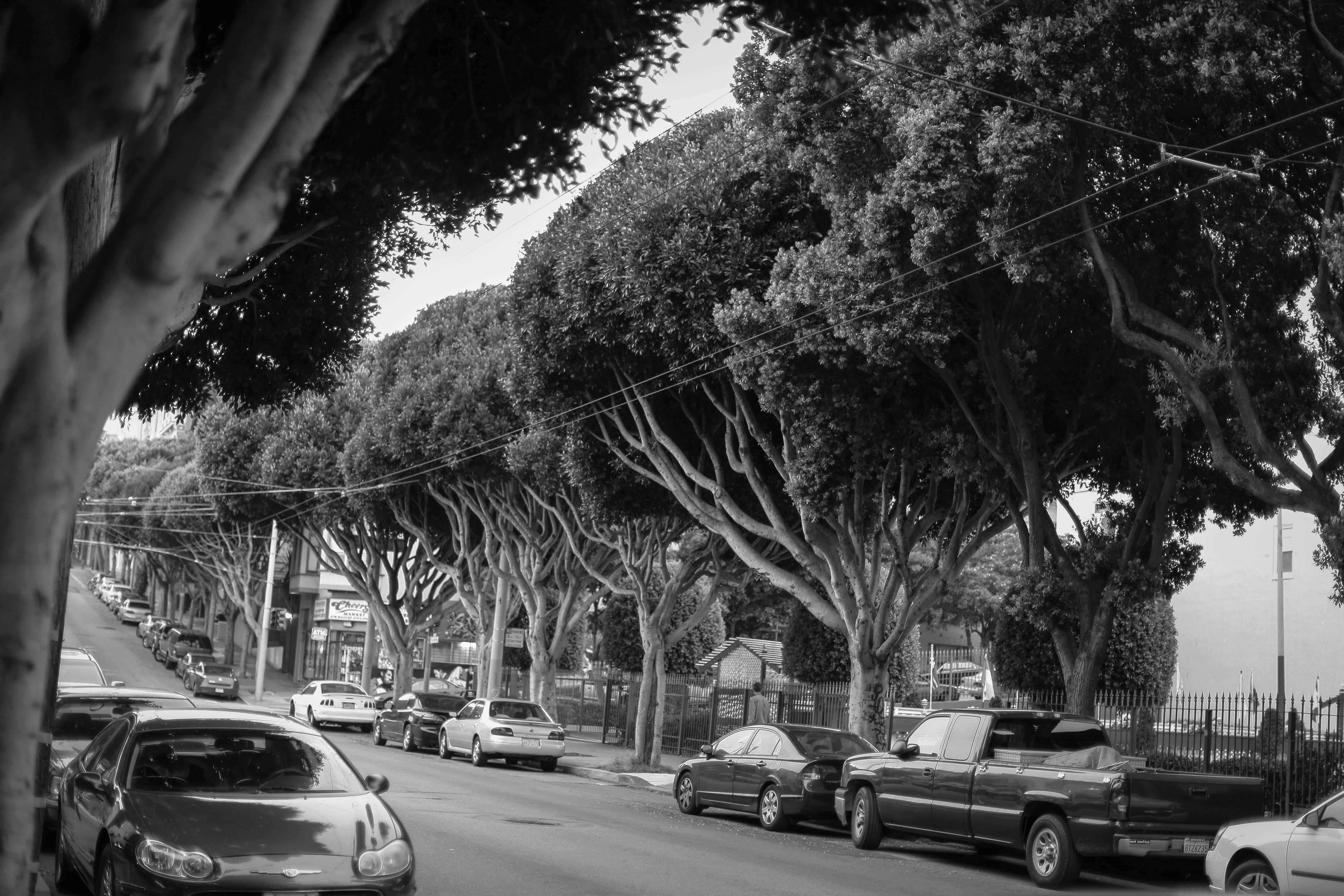 This photograph presents a serene, tree-lined street captured in black and white, where the towering trees form a natural canopy over parked cars. The soft lighting enhances the tranquil mood, inviting contemplation as shadows stretch gently across the pavement. The composition leads the eye along the lined trees, creating a sense of depth and peaceful solitude in an urban setting.