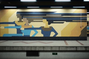 This photograph captures a vibrant geometric mural that adorns a subway station wall, blending shades of blue, yellow, and earthy tones. The artwork conveys a sense of movement and energy, contrasting with the subdued lighting that highlights the linear forms. The overall composition invites viewers to contemplate the interplay between urban architecture and artistic expression.