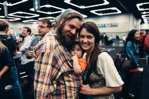 In a bustling convention center, a bearded father cradles his young child while his partner beams beside them, creating an atmosphere of warmth and familial joy. The playful checkered pattern of the father's shirt contrasts with the soft hues of the mother's attire, enhancing the intimate yet vibrant mood. The ambient lighting and blurred background filled with mingling attendees amplify the focus on this affectionate trio, capturing a moment of connection amidst the lively environment.