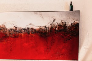 A striking abstract painting dominates the scene with a dramatic interplay of deep reds and muted whites, evoking both passion and turbulence. The composition is enhanced by a single green bottle perched atop, adding an organic touch to the bold strokes and textures. Soft lighting further accentuates the layers of paint, creating a mood that is both intense and contemplative.