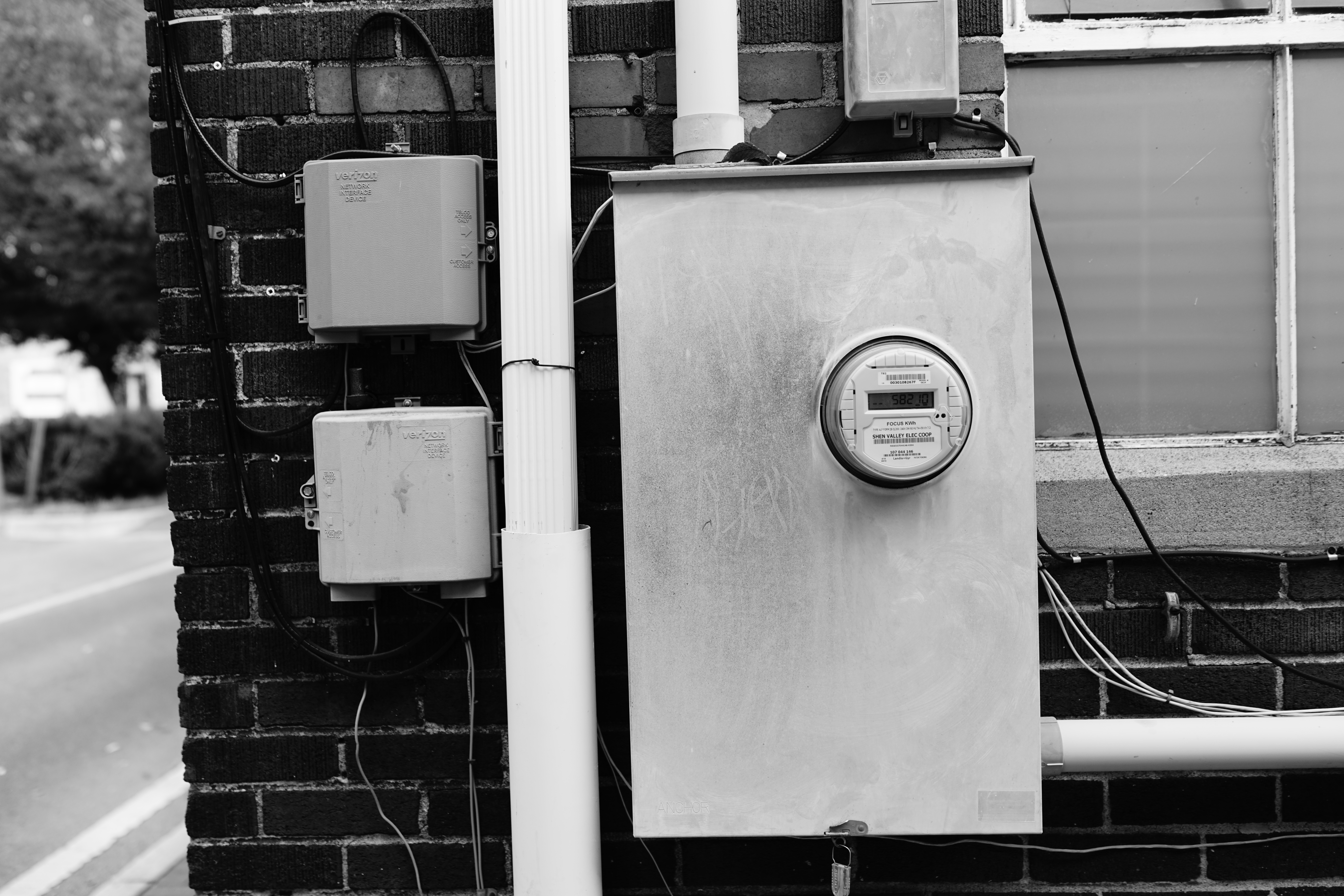 This black-and-white photograph captures the stark presence of electrical meters against a textured brick wall. The composition emphasizes the interplay of geometric shapes and lines, inviting a sense of industrial simplicity. The subdued lighting enhances the gritty mood, drawing attention to the functional aspects of urban life.