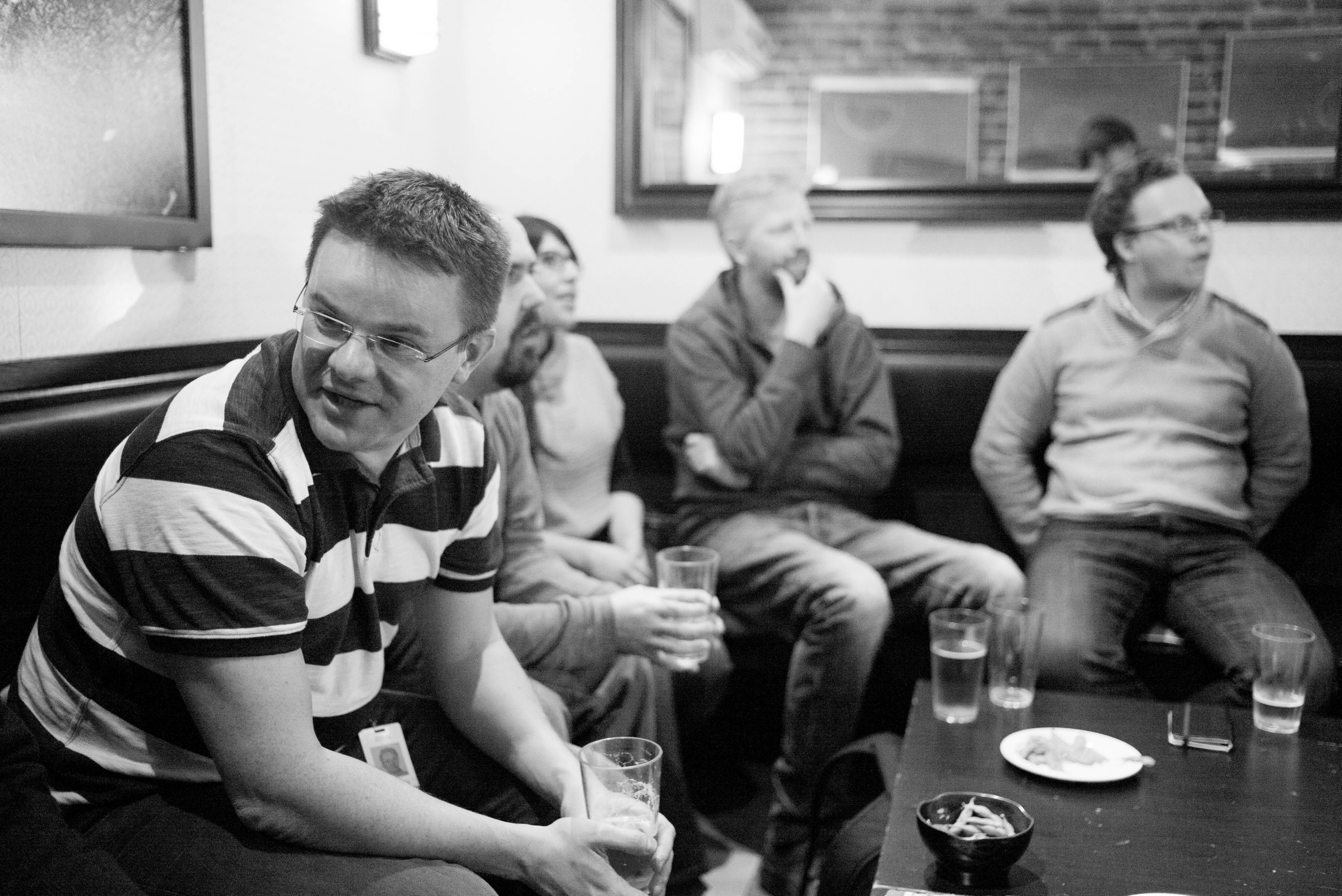 In a cozy pub setting, a group of friends engages in lively conversation, their faces reflecting a mix of laughter and contemplation. The black and white tones enhance the intimate atmosphere, while soft lighting creates a warm, inviting mood. The composition captures the dynamic energy of the group, drawing the viewer into their shared experience.