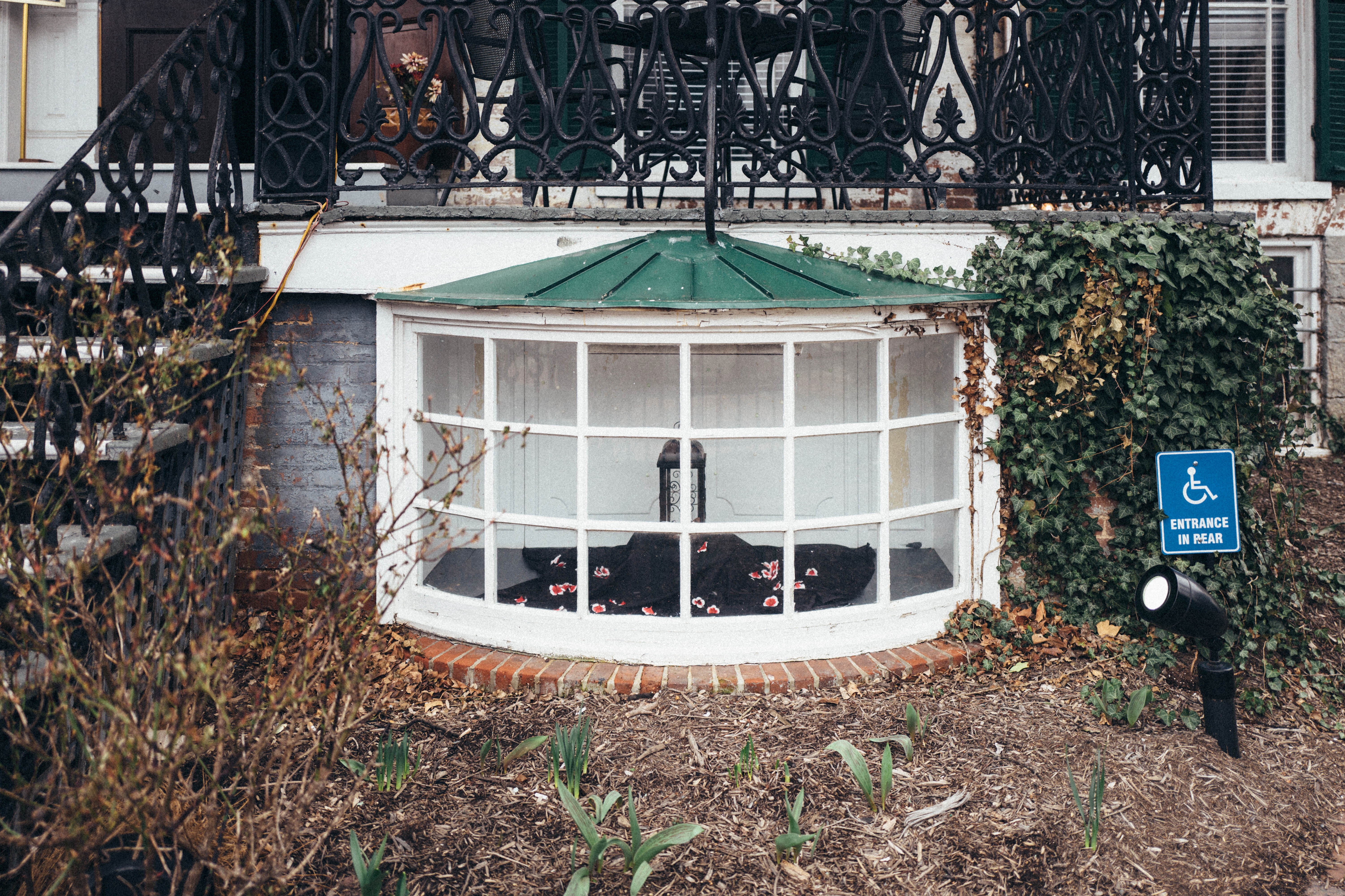 This photograph captures a quaint, rounded window nook beneath a wrought-iron balcony, displaying a cozy arrangement with dark fabrics and subtle floral hints. The mood is serene and inviting, enhanced by muted natural light filtering through the glass. Surrounding greenery and a wheelchair access sign add layers of context, grounding the composition in a charming urban setting.