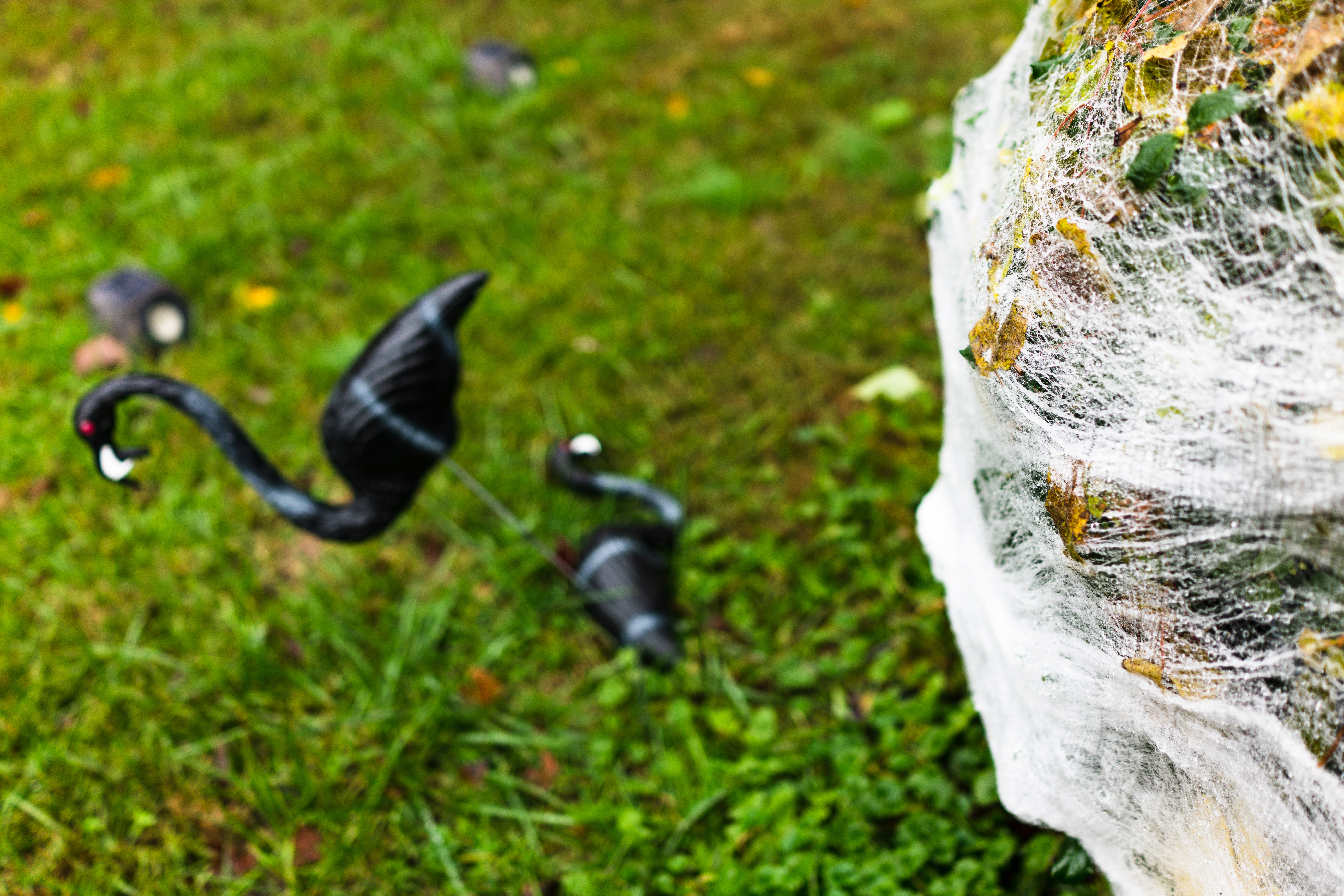 In a curious blend of nature and artifice, a pair of black swan decorations stand guard amidst the overgrown grass, partially obscured by a veil of spiderwebs. The muted lighting creates an eerie yet playful atmosphere, highlighting the contrasting textures of the delicate web and the plastic birds. This composition invites contemplation of the juxtaposition between artificial beauty and natural decay.