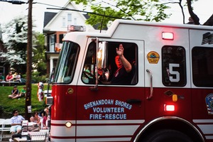 In this vibrant snapshot, a smiling firefighter waves from the driver's seat of a red firetruck, embodying community spirit and camaraderie. The scene is set during twilight, with a blurred crowd in the background creating a lively atmosphere, while warm lights illuminate the truck, casting a welcoming glow. The composition captures both the pride of the volunteer service and the joy of the event, inviting viewers to appreciate the warmth of local engagement.