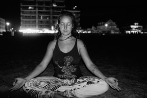 A woman sits serenely on the beach at night, her eyes closed in deep meditation. The stark black-and-white tones create a contemplative mood, contrasting her relaxed posture against the blurred lights of buildings in the background. Soft shadows accentuate her features, enhancing the sense of calm and introspection in the scene.