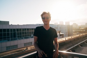 In this vibrant photograph, a young man stands against a backdrop of urban architecture, exuding a carefree energy. The golden sunlight casts a warm glow, accentuating his joyful expression and the carefree ambiance of the scene. The composition balances the figure with the striking lines of the cityscape, enhancing the feeling of openness and freedom.