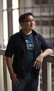 A young man stands pensively by a balcony, bathed in soft, natural light filtering through the spaces between the buildings behind him. His relaxed pose and slight smile suggest a moment of quiet reflection, while the contrasting shadows and highlights create a warm, inviting atmosphere. The composition draws the viewer's eye to his thoughtful expression, framed by the architectural lines around him.