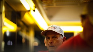 In this intimate portrait, a weathered man gazes intensely, his expression hinting at quiet contemplation amidst the bustling environment of a bus. The warm yellow overhead lights create a soft glow, illuminating his features while casting a moody ambiance, contrasting with the darker surroundings. The close composition invites viewers to connect with his story in a moment frozen in time.