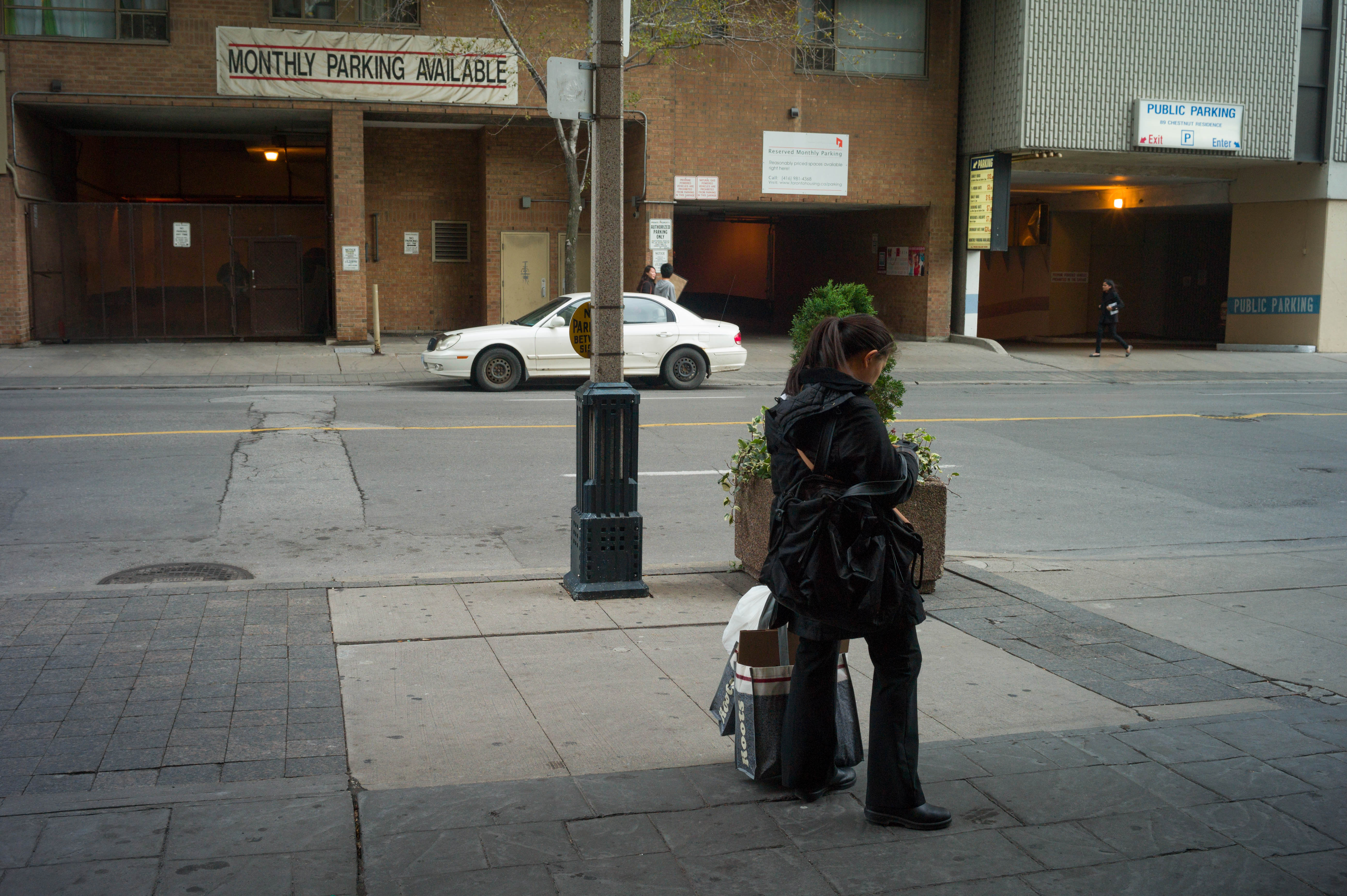 The photograph captures a moment of quiet solitude on a bustling city street. A woman in all black stands with her back to the camera, engrossed in her phone while surrounded by urban elements, including parked cars and parking signs. The muted lighting and soft colors create a reflective mood, contrasting with the potential vibrancy of the busy environment around her.