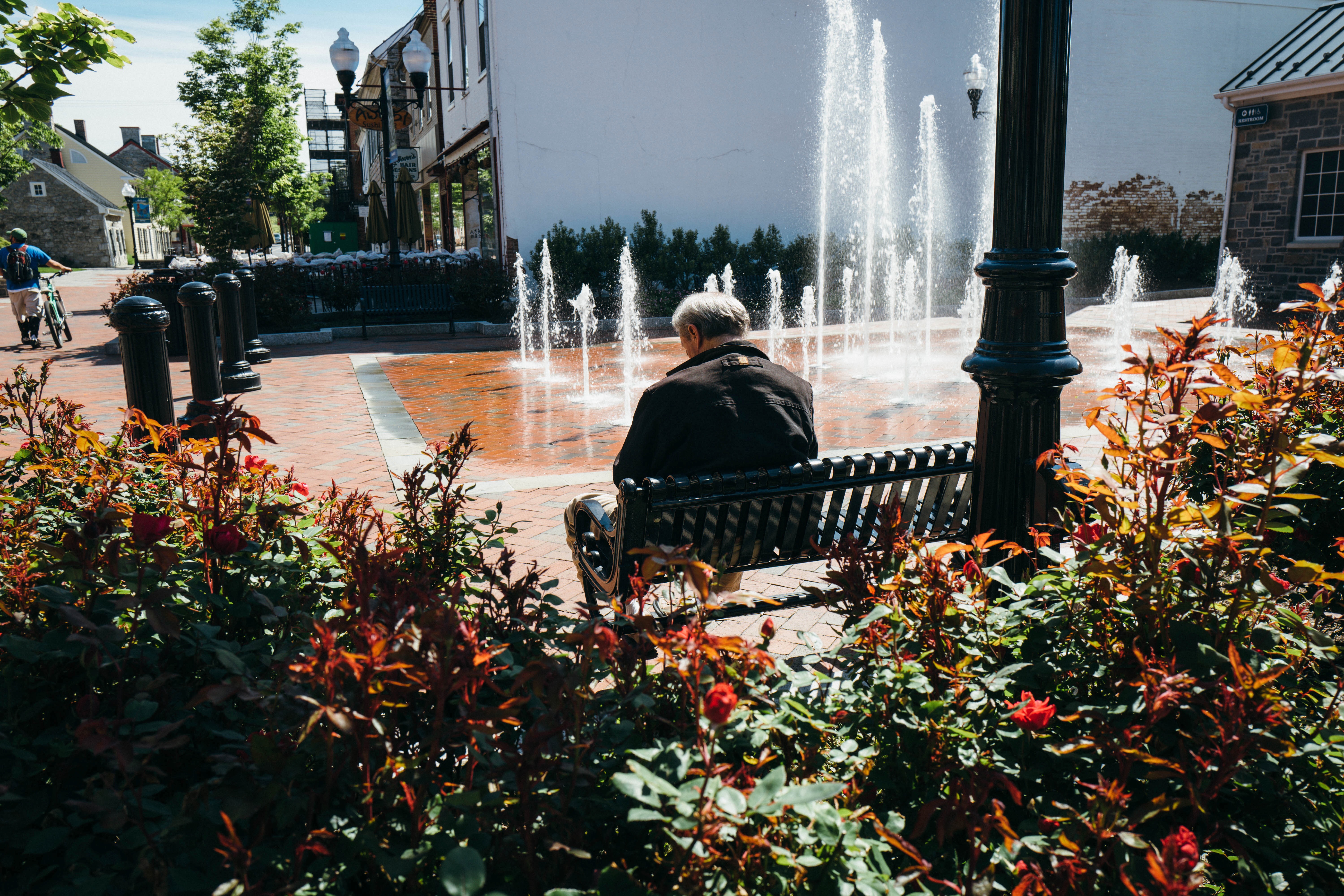 An elderly man sits peacefully on a bench, facing a lively fountain that plays against the backdrop of vibrant flowers. The bright daylight enhances the tranquil atmosphere, creating a serene escape from the bustling surroundings. The composition captures a moment of quiet reflection amidst the beauty of nature and urban life.