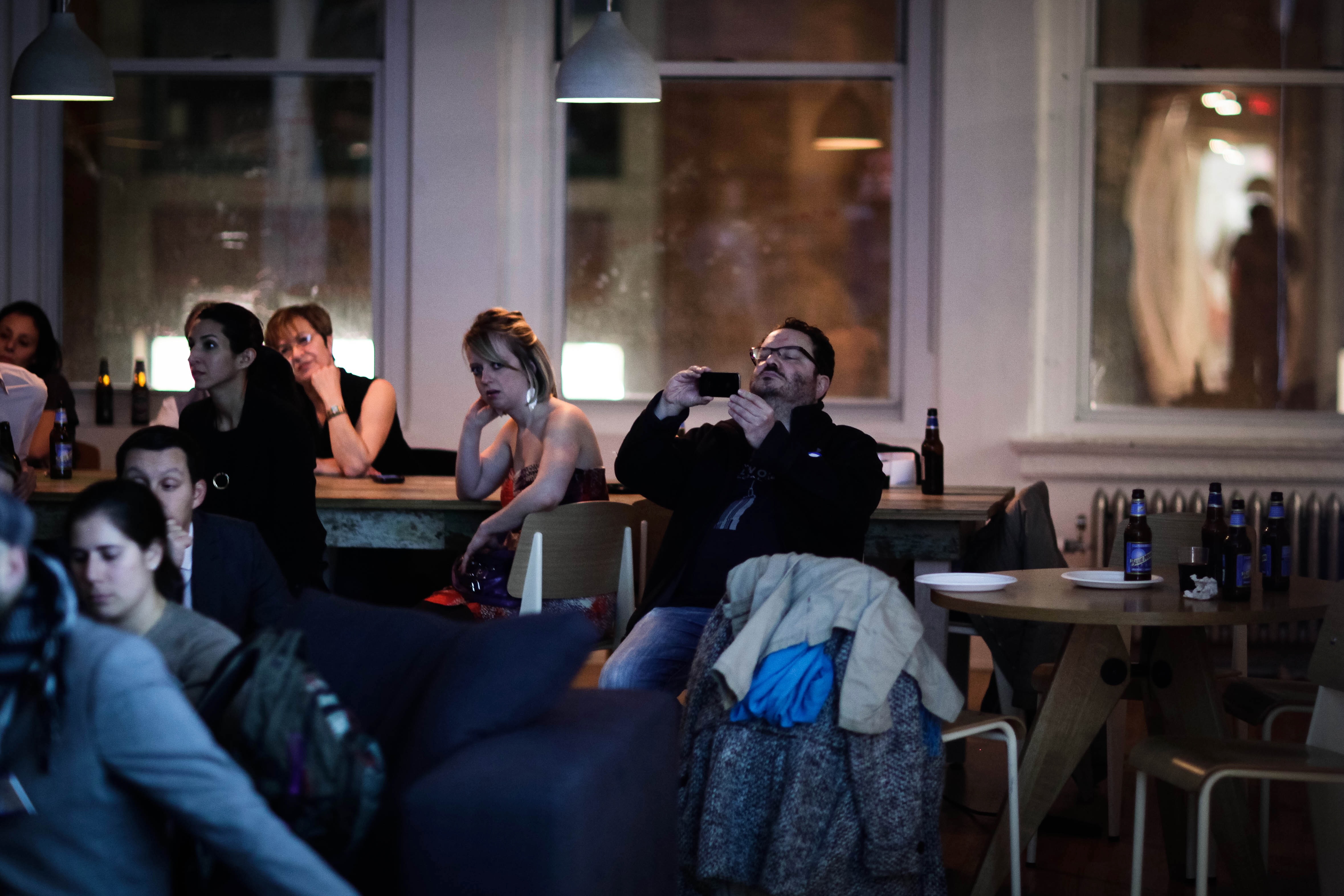In this intimate indoor setting, a small group of individuals sits absorbed in their surroundings, with varying expressions of engagement and contemplation. The soft, ambient lighting creates a contemplative mood, while the blurred background hints at further activity beyond the gathering. The composition captures a moment of quiet connection among people, framed by the cozy yet casual decor.