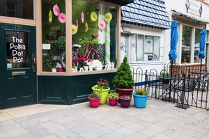 This photograph captures the whimsical exterior of 'The Polka Dot Pot', showcasing a vibrant storefront adorned with a bright pink bicycle and colorful decorations. Potted plants in a variety of hues add an inviting touch to the scene, while natural light enhances the cheerful atmosphere. The composition balances elements of nature and urban charm, creating a delightful neighborhood vignette.