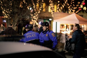 Two police officers in bright blue uniforms stand vigilant amidst a festive crowd under twinkling lights. The scene captures a blend of authority and community, as warm ambient light illuminates the joyful expressions of passersby. The juxtaposition of law enforcement and celebratory elements evokes a sense of safety within the bustling night.