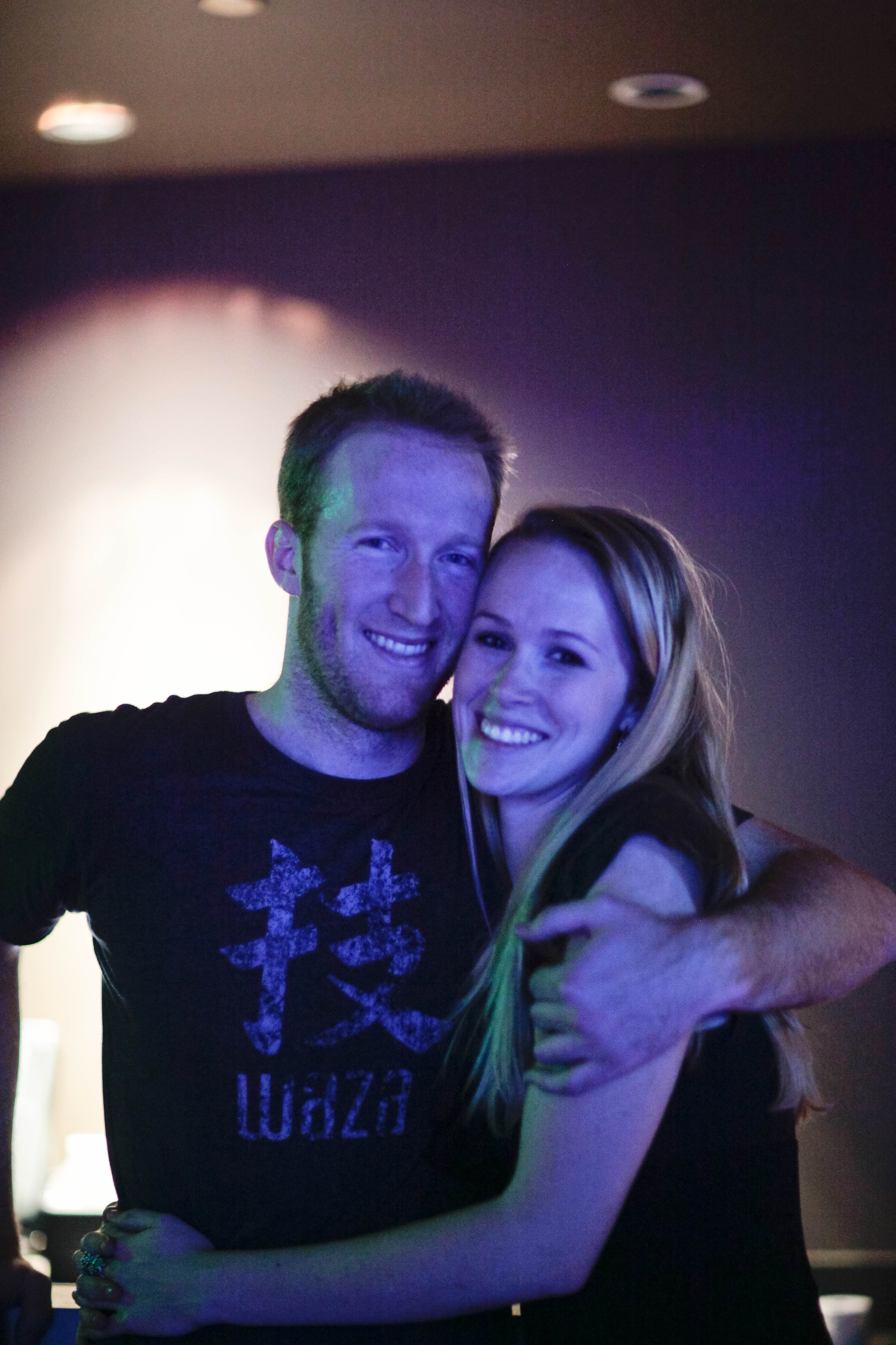 In a warmly lit interior, two friends share a joyous moment, their smiles radiating happiness and camaraderie. The soft glow of ambient lighting highlights their connection, creating an intimate atmosphere that captures a carefree celebration. The composition, with them centered and embracing, conveys a sense of unity and joy amidst a lively backdrop.