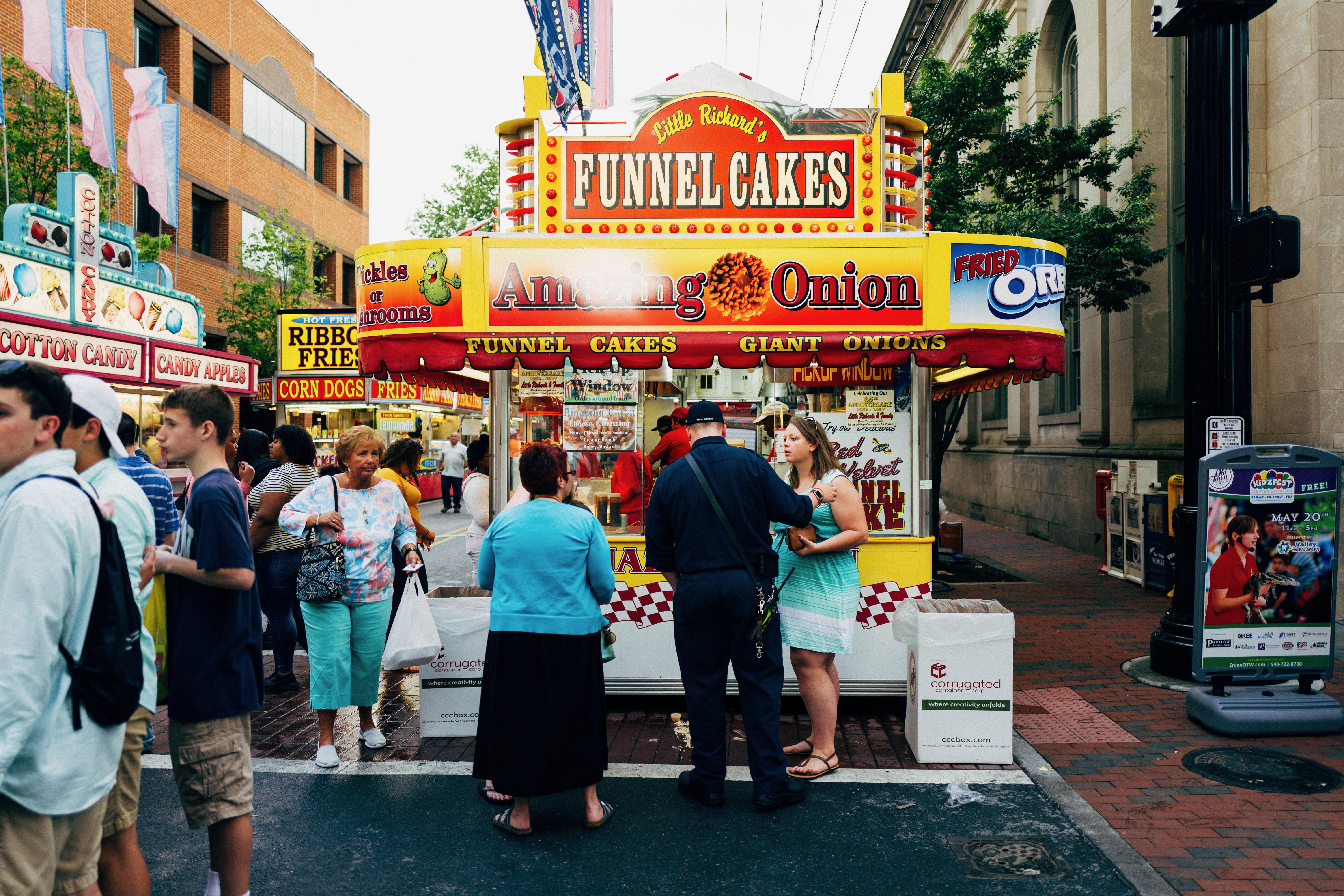 The vibrant colors of the funnel cake stand draw the eye amidst the bustling fairground atmosphere. A group of people surrounded by a selection of enticing food stalls exude a sense of excitement and camaraderie. Soft, natural lighting enhances the cheerful mood, highlighting the joy of enjoyment and community.