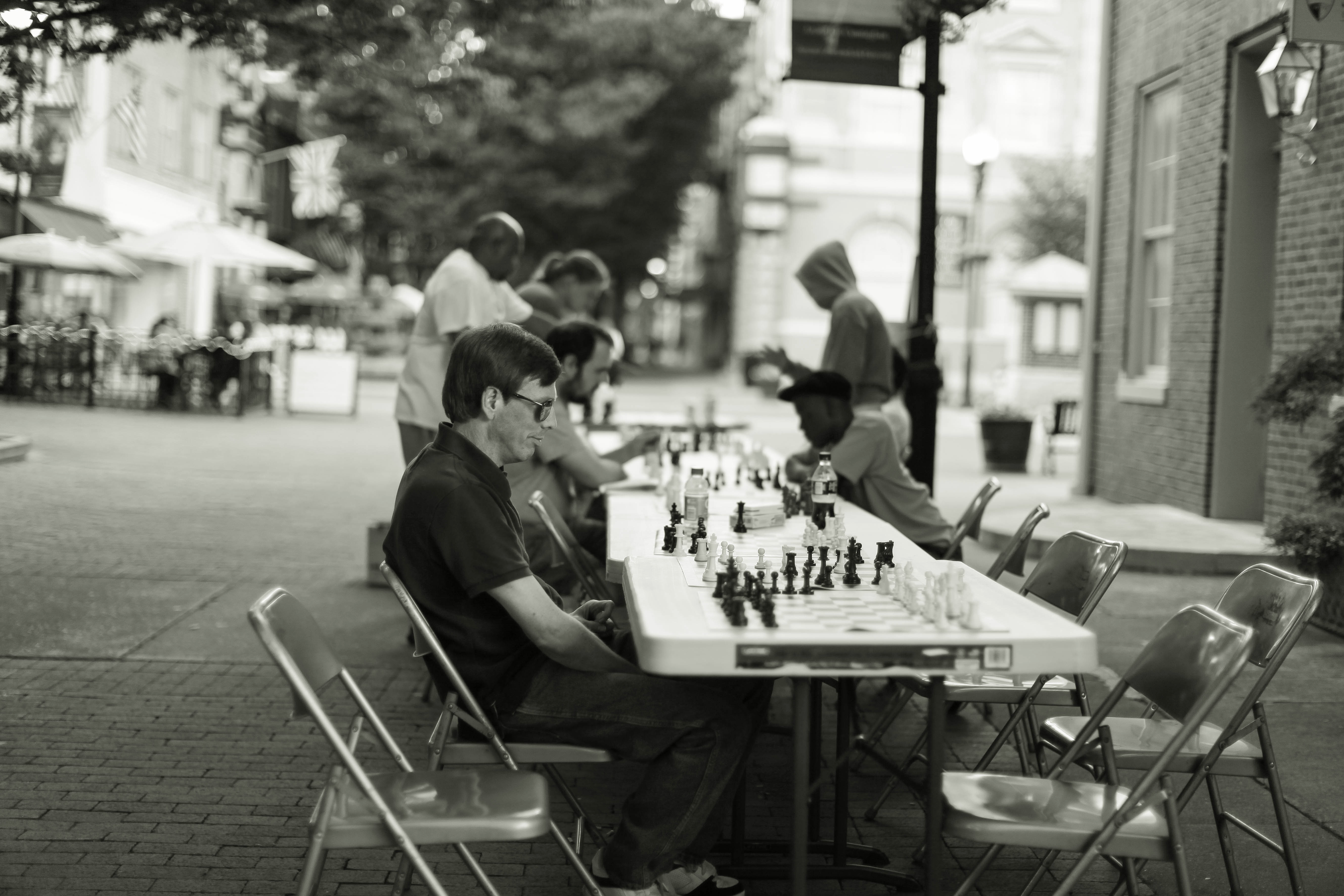 A monochromatic scene captures a street chess gathering, with players focused deeply on their strategies. Dimly lit, the atmosphere evokes a contemplative mood as shadows dance across the tables, highlighting the intensity of the game. The composition draws the eye along the row of players, creating a sense of camaraderie in their quiet competition.