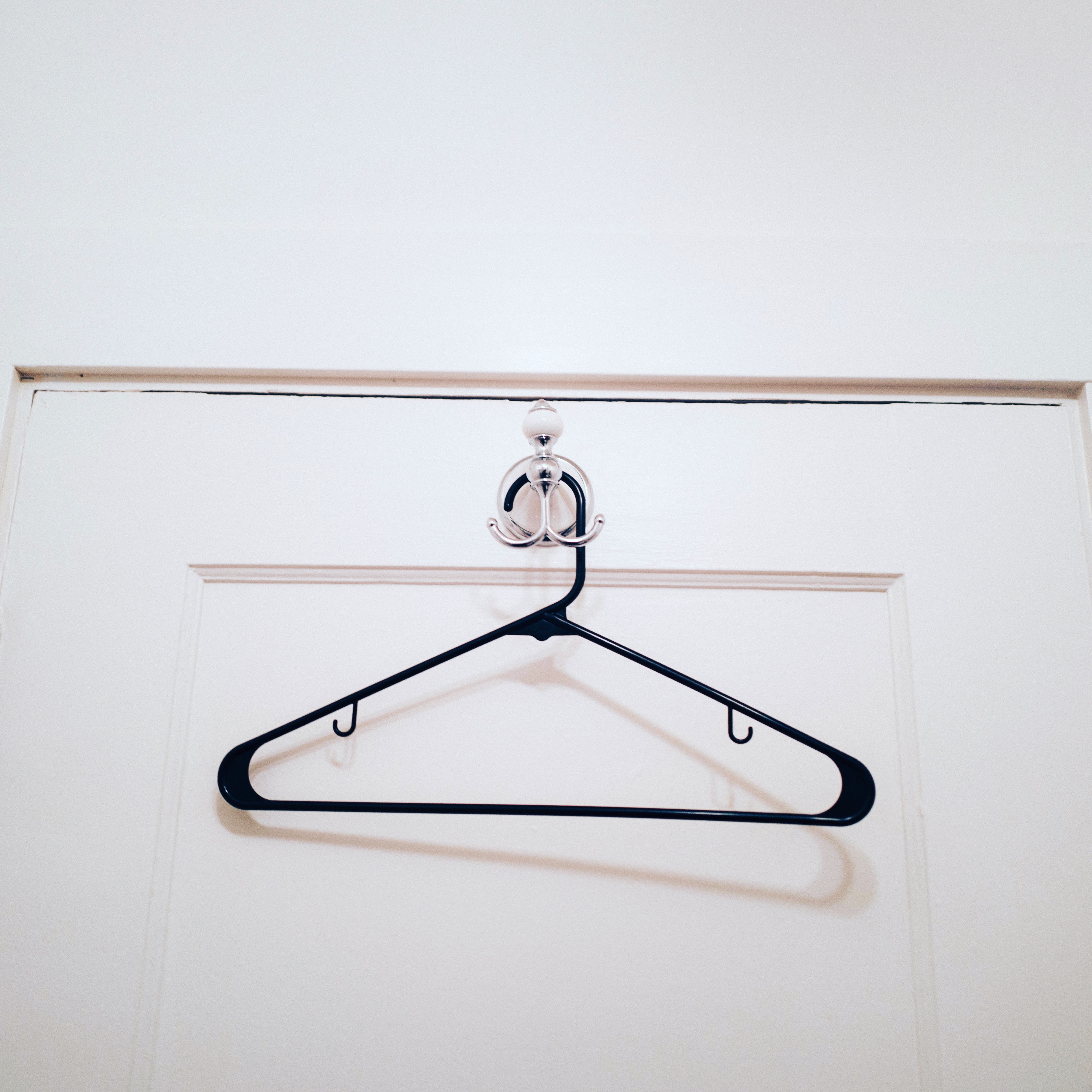 A simple black hanger is suspended from a polished silver hook against a stark white door, creating a striking contrast. The composition exudes a calm and understated elegance, while the soft lighting casts gentle shadows that add depth to the scene. This minimalist arrangement evokes feelings of solitude and simplicity, inviting reflection in its quiet charm.