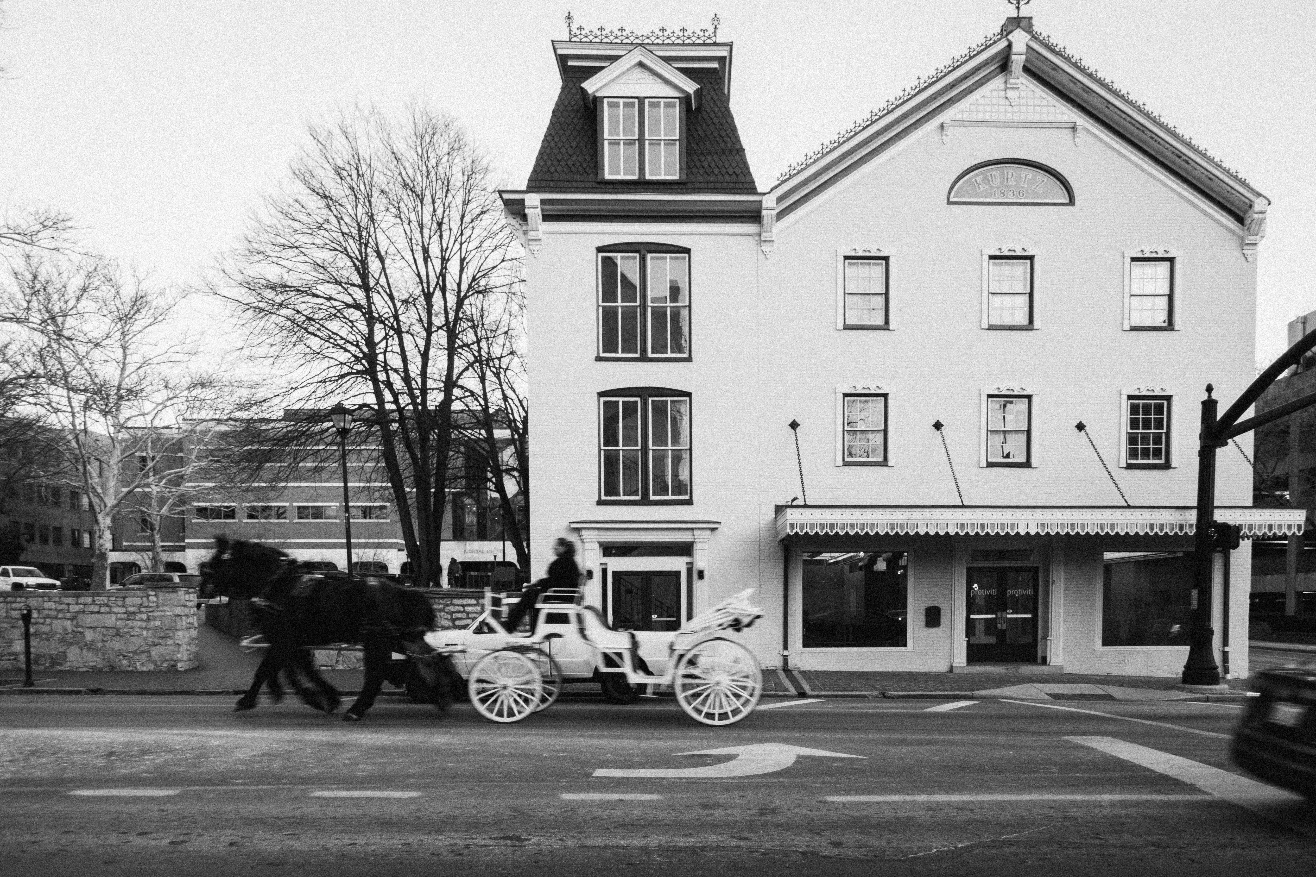 In a serene black and white composition, a horse-drawn carriage glides past a quaint, vintage-style building, creating a nostalgic atmosphere. The stark contrast emphasizes the elegant lines of the architecture, while soft tree branches frame the scene, enhancing the timeless quality. The even lighting envelops the street, contributing to a sense of calm in an otherwise bustling world.