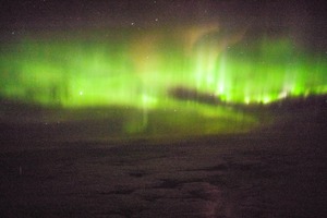 This breathtaking photograph captures the ethereal glow of the Northern Lights, illuminating the dark sky with vibrant shades of green. The composition showcases the fluidity and movement of the aurora, creating a sense of wonder and serenity. Shadows below hint at a vast, snow-covered landscape, enhancing the otherworldly mood of the scene.