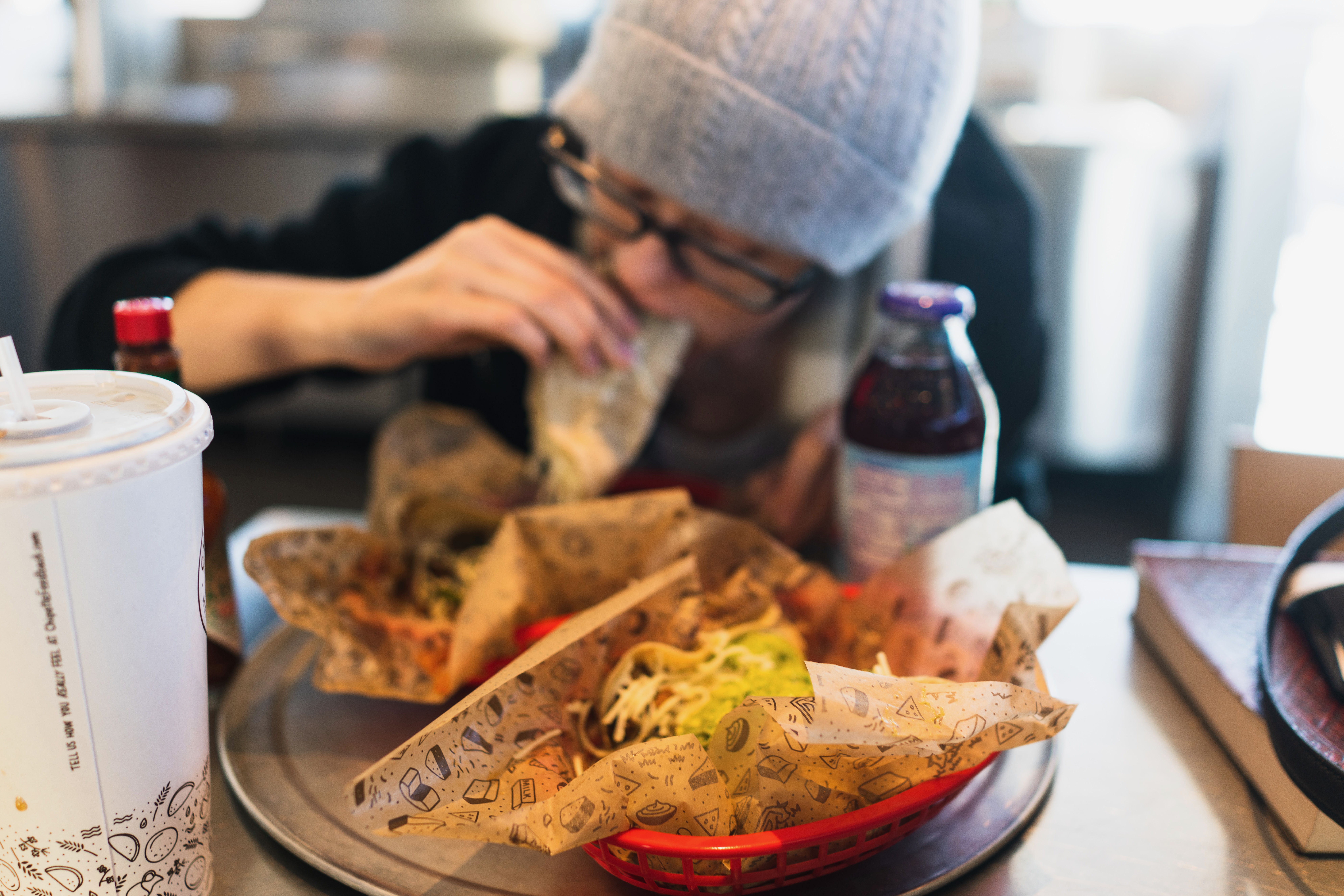 A woman in a cozy beanie leans eagerly over a plate filled with vibrant, freshly made tacos, her intense focus capturing the joy of indulgence. The warm, inviting light creates a relaxed atmosphere, while the simple composition emphasizes the food as the centerpiece of this intimate dining experience.