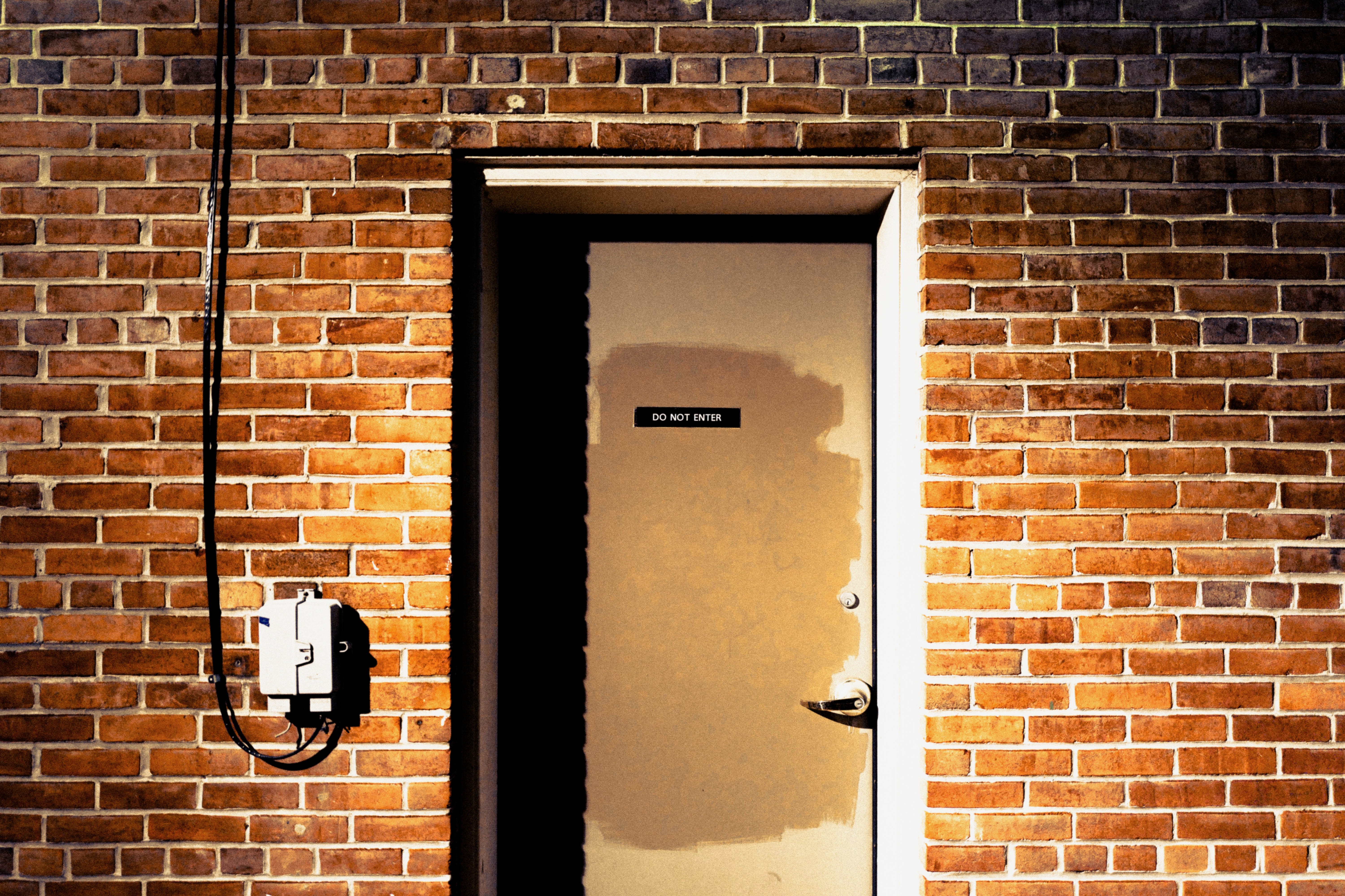 A muted door stands against a textured brick wall, its surface marked by a patch of paint that hints at past wear. Strong light casts shadows, enhancing the starkness of the 'DO NOT ENTER' sign, creating an air of mystery and restriction. The composition draws the eye to this solitary entrance, evoking curiosity and a sense of foreboding.