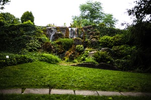 This photograph captures a serene waterfall cascading over moss-covered rocks, surrounded by lush greenery. The soft, diffused light creates a tranquil atmosphere, inviting viewers to lose themselves in the peaceful composition. The vibrant plants and neatly manicured grass frame the scene, enhancing the natural harmony of this garden retreat.