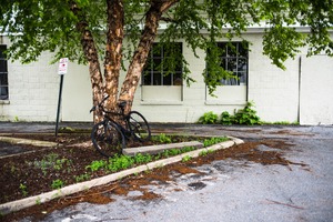 A solitary black bicycle leans against a textured, sturdy tree, partially hidden by the lush greenery around it. The muted colors of the gray wall and the pavement create a contemplative, slightly melancholic mood, enhanced by soft, diffused lighting. This composition captures a moment of stillness in a busy urban setting, inviting viewers to pause and reflect on impermanence.