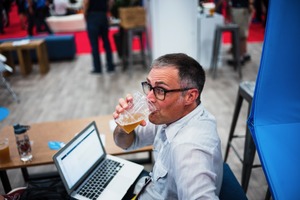 In a bustling environment, a man glances playfully over his shoulder while enjoying a drink, exuding a relaxed yet engaged demeanor. His laptop is open, suggesting he balances work with leisure in a vibrant, social setting. The warm lighting and blurred background elevate the casual, communal atmosphere of the space.
