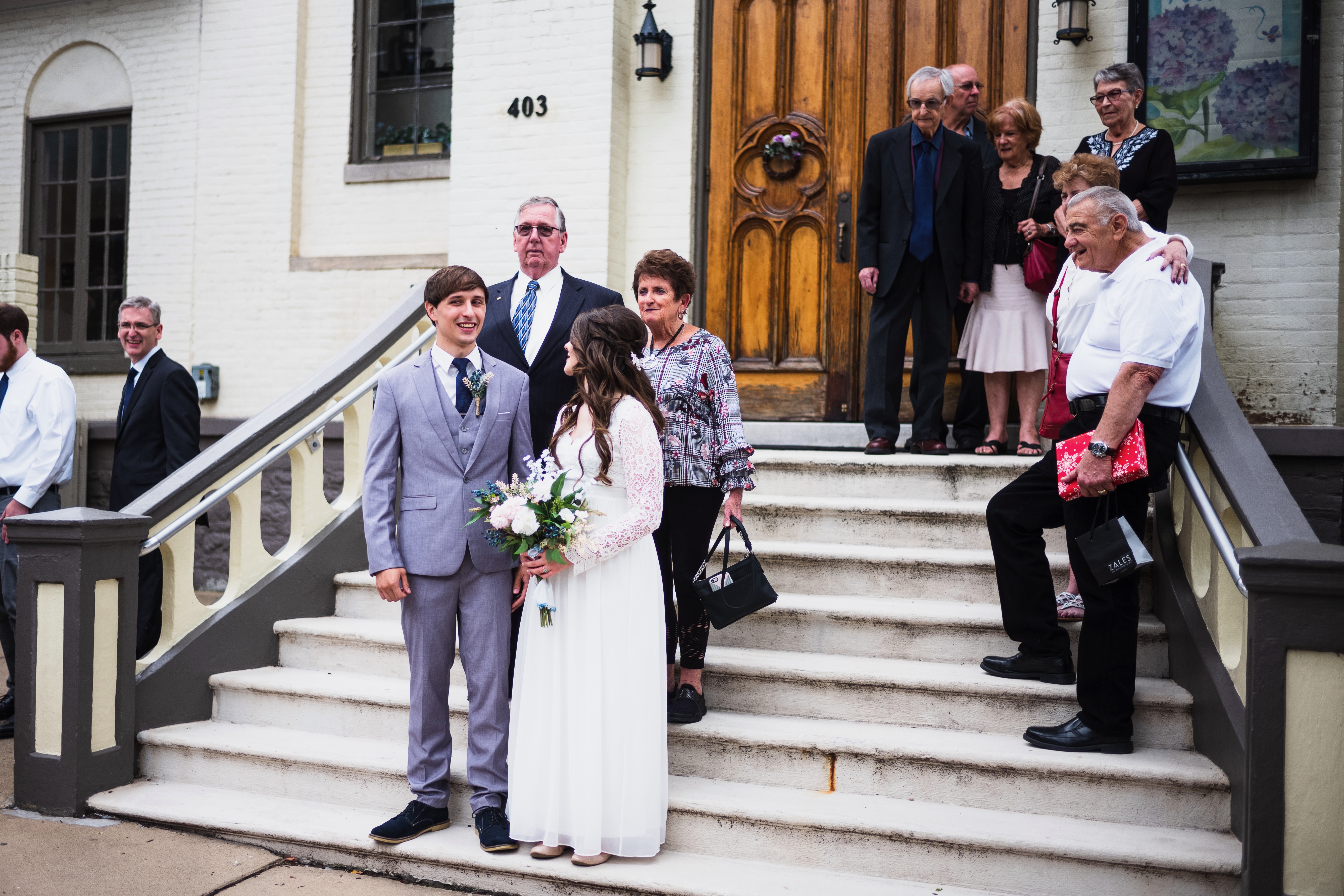 In this warm gathering, a bride and groom stand proudly on the steps, surrounded by smiling family members, all dressed in a mix of formal and stylish attire. The soft, natural light enhances the joyful atmosphere, highlighting the laughter and love on their faces. The composition, with the rich wooden door as a backdrop, adds a classic touch to this intimate moment.
