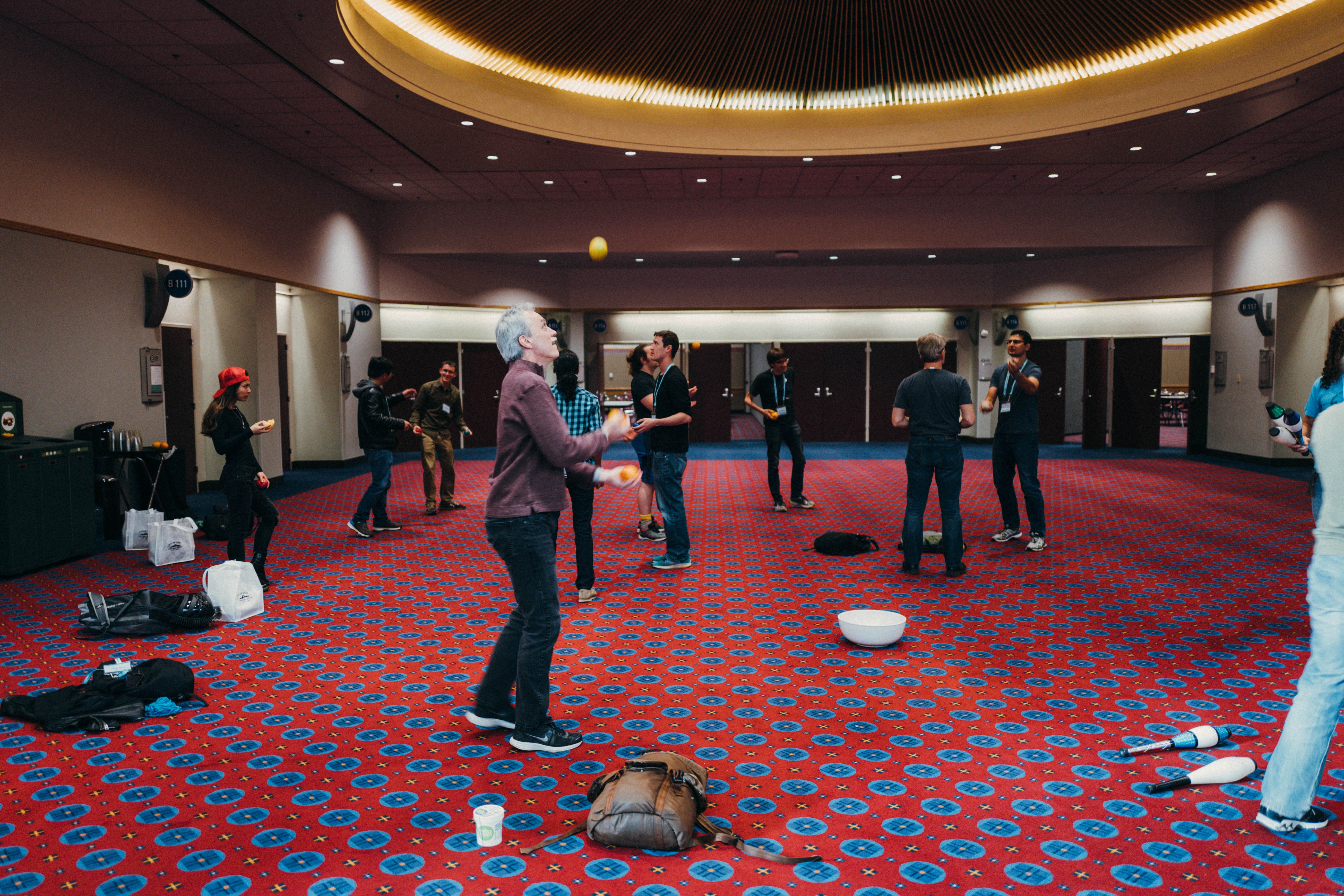 In a spacious, brightly lit room adorned with a vibrant patterned carpet, several individuals engage in the playful art of juggling. The atmosphere is lively and filled with a sense of camaraderie, as each juggler focuses intently on their craft, illuminated by soft overhead lighting that casts a warm glow. The scene captures a moment of shared joy and creativity among friends and enthusiasts in a casual setting.