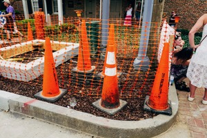 This photograph captures a cluster of bright orange traffic cones enclosed by construction fencing, set against a backdrop of muted brick and greenery. The contrast between the vibrant cones and the earthy tones of the mulch creates a striking visual effect, evoking a sense of disruption in an otherwise serene environment. The presence of people in the background hints at life and activity, juxtaposing the stillness of the barriers.