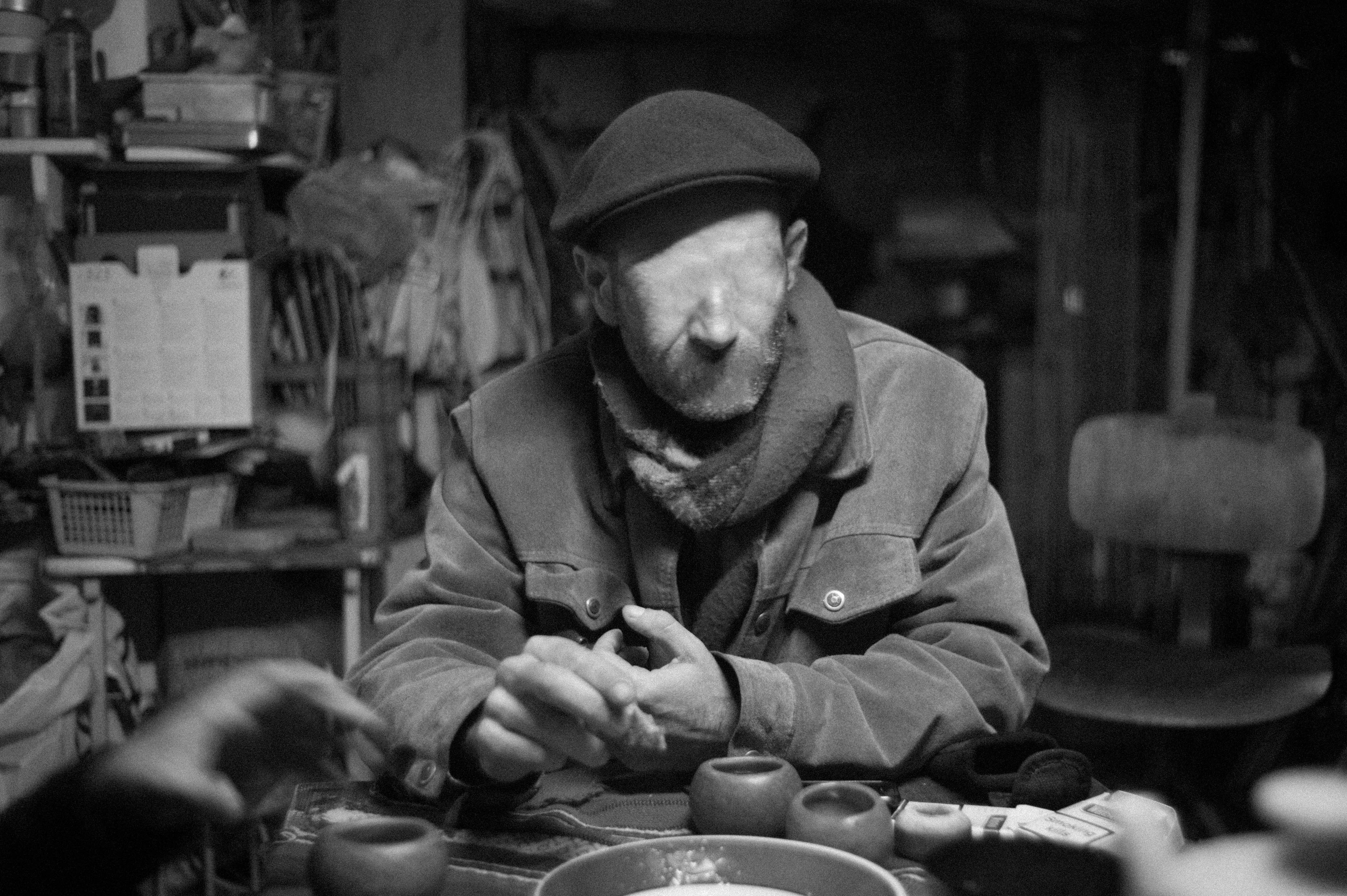 In a dimly lit setting, an elderly man sits at a table surrounded by handmade pottery. His face, obscured in shadow, evokes a sense of mystery, while the soft focus emphasizes his contemplative posture. The muted tones and intimate composition draw the viewer into a moment of serene reflection amid the clutter of his surroundings.
