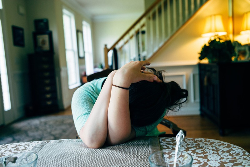 In a softly lit room, a person is seated at a table, their arms draped across their head in a gesture of contemplation or distress. The composition captures a sense of isolation amidst a warm, inviting environment, contrasting the personal struggle with the serene backdrop of home. Light filters through the windows, enhancing the mood of introspection and vulnerability.
