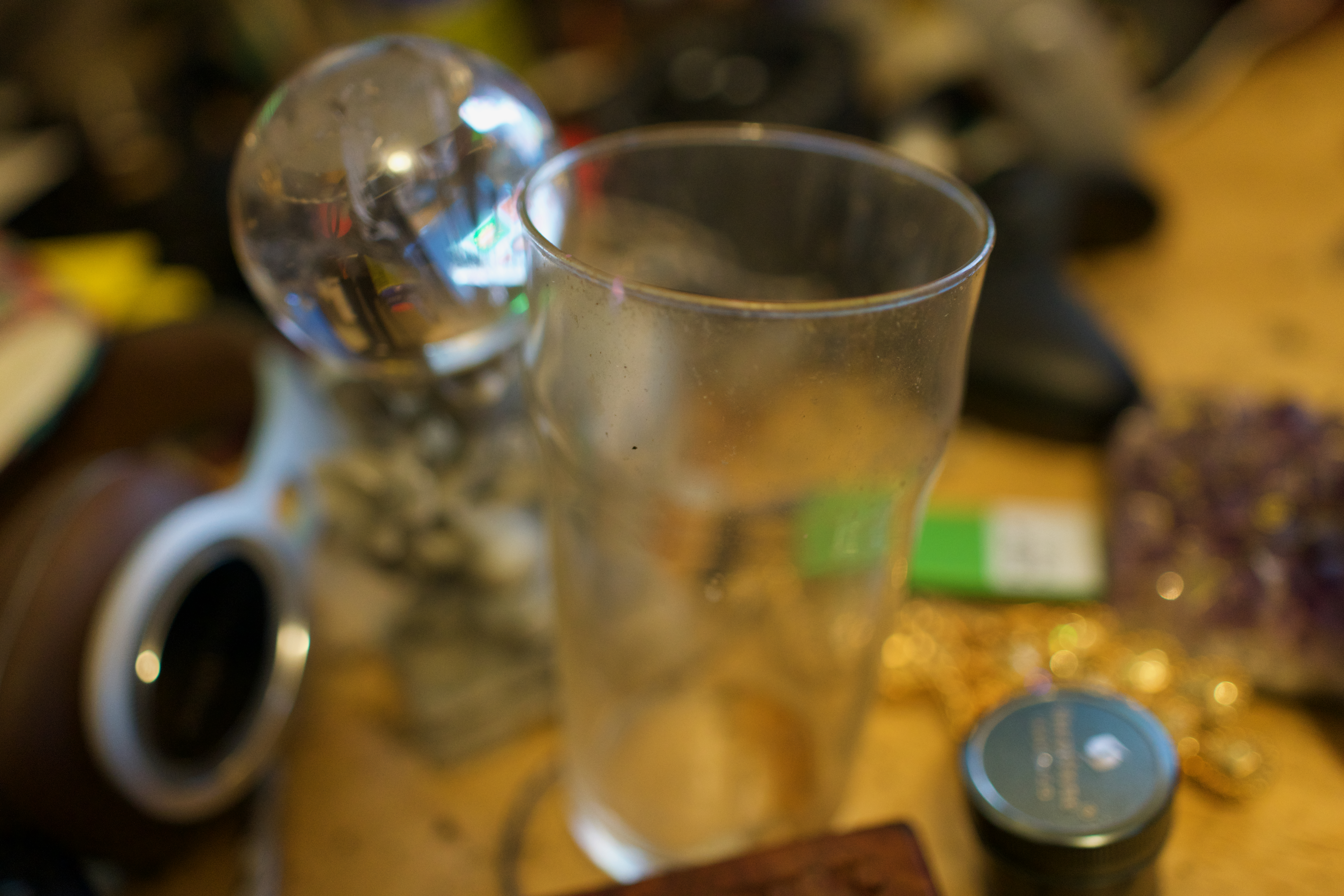 This photograph captures a chaotic tabletop scene, dominated by a partially filled glass and a glass orb reflecting colorful light. The soft focus on the glass creates a sense of mystery, while the warm, diffuse light adds a cozy yet cluttered mood, evoking a feeling of intimacy within disarray.