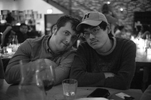 Two friends share a candid moment in a dimly lit restaurant, their expressions conveying a mix of playfulness and introspection. The soft, warm glow from surrounding candles enhances the intimate atmosphere, while the blurred background suggests a bustling social scene. The monochromatic palette emphasizes their closeness, drawing the viewer's attention to their friendly camaraderie.
