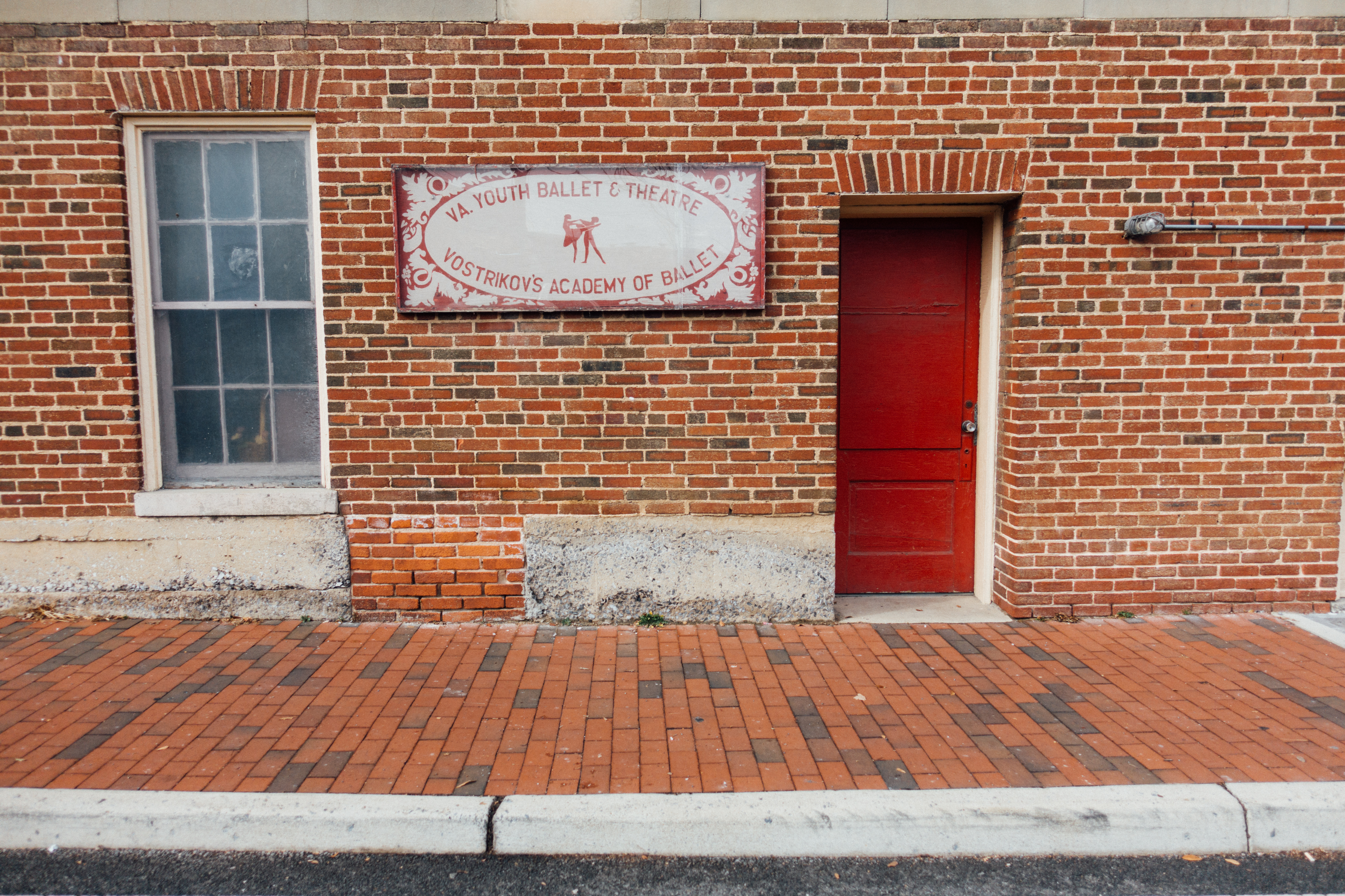 The photograph captures the façade of a brick building marked by a vintage sign for a ballet academy, evoking a sense of nostalgia and tradition. The soft morning light casts gentle shadows, illuminating the rich textures of the bricks and the vibrant red door, inviting curiosity yet preserving a quiet ambiance. A neatly paved walkway leads the eye, suggesting a path to creativity and grace within.