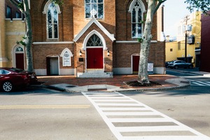 The photograph captures a beautiful brick church with striking red doors, nestled at the corner of a bustling street, framed by leafy trees. The warm afternoon light casts gentle shadows, creating an inviting atmosphere while the crosswalk guides the viewer's eye towards the entrance. The composition balances the church's architectural details with the urban environment, evoking a sense of tranquility amidst city life.