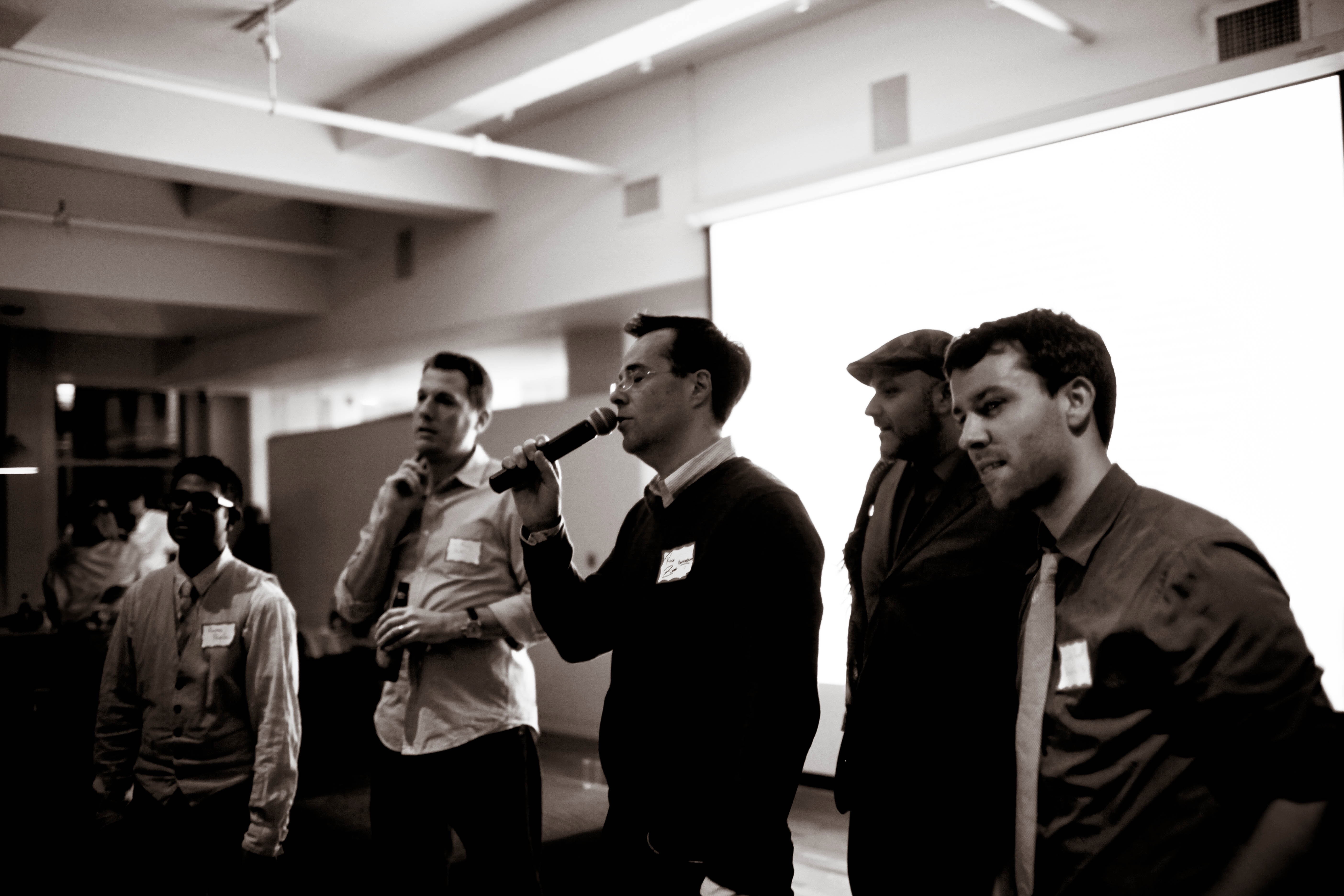 Five individuals stand together, exuding confidence and camaraderie as one speaks into a microphone. The soft monochrome tones emphasize their expressions, creating a serious yet engaged atmosphere, while the well-lit backdrop draws focus to the speakers. The composition captures a moment of connection and shared purpose, set against a backdrop of modernity.