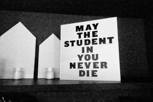 This monochromatic photograph captures a striking book with bold lettering set against a minimalist backdrop of geometric shapes. The strong message serves as a poignant reminder of lifelong learning and inquisitiveness. Soft lighting accentuates the contrasts, creating an introspective mood that invites contemplation.