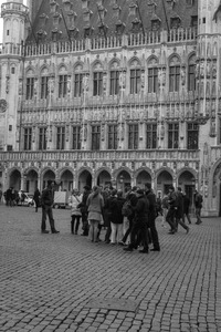 A bustling crowd congregates in front of an intricately detailed Gothic building, its architectural grandeur looming in the background. The photograph, captured in black and white, evokes a sense of timelessness and exploration, as onlookers engage in conversation against the cobblestone pavement. The soft lighting highlights the textures of the stone and the expressions of curiosity on the faces of the visitors, creating a lively yet contemplative atmosphere.