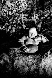 A weathered stone statue of a laughing Buddha reclines against a rugged rock, partially enveloped by lush foliage. The interplay of light and shadow casts a tranquil, almost mystical atmosphere, highlighting the figure's content expression. The black and white setting enhances the meditative mood, inviting a sense of peace and reflection.