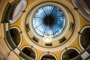 This photograph captures the intricate beauty of a grand dome, viewed from below, showcasing its remarkable stained glass and circular design. The warm hues of yellow and soft light emanating from the chandelier create a welcoming and serene atmosphere, inviting contemplation. The symmetry and graceful arches frame the dome, enhancing the architecture's elegance and grandeur.