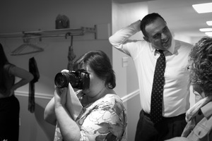 In this intimate black and white photograph, a woman focuses intently on her camera, capturing a moment in time while surrounded by engaged friends. The soft lighting creates a warm atmosphere, contrasting with the crisp details of attire and expressions, highlighting the genuine joy of shared experiences. The composition, drawing attention to the photographer, invites the viewer into a cozy, communal space filled with laughter and anticipation.