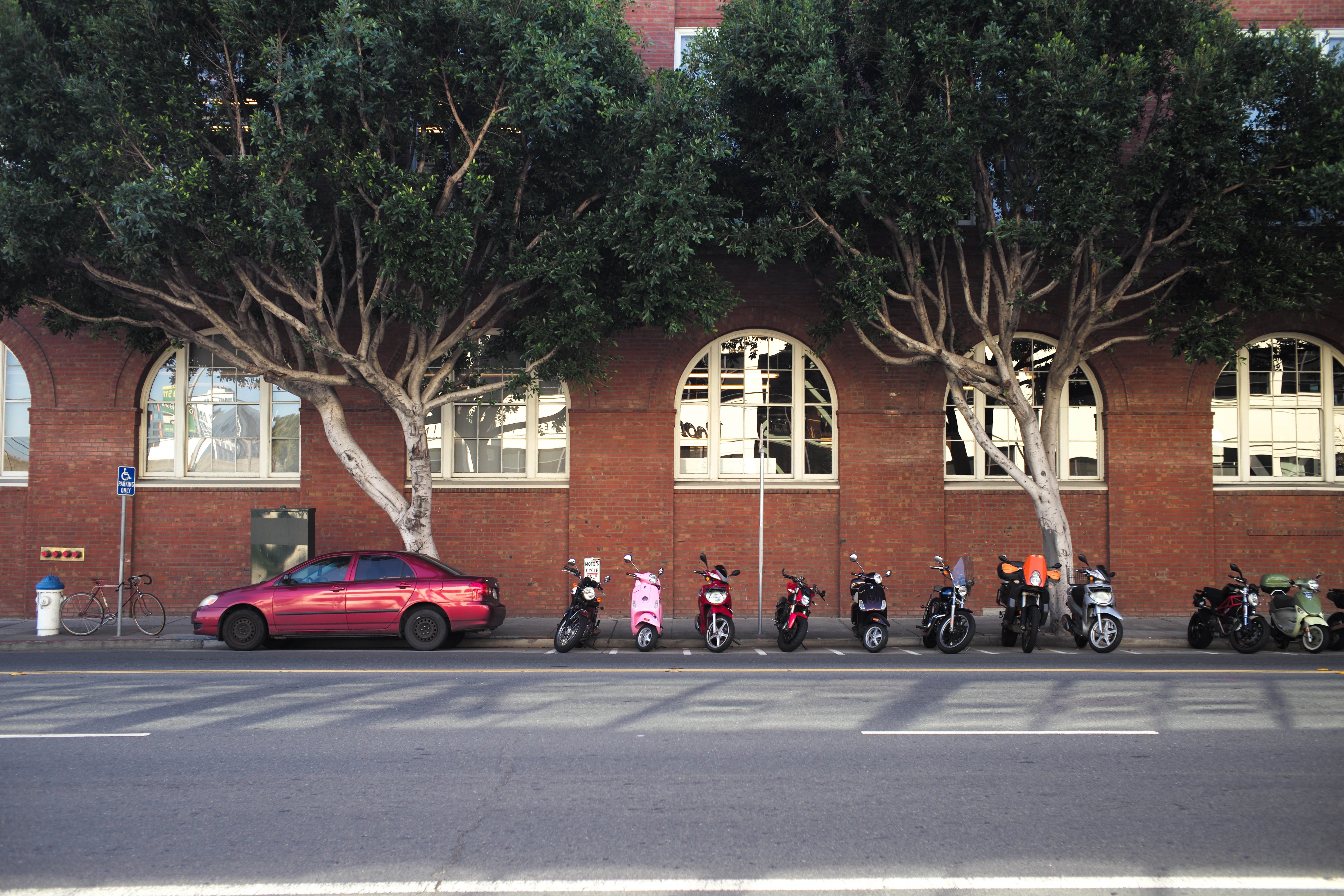 This photograph captures a row of scooters lined up beside a striking red-brick wall, adorned with large arched windows. Towering trees provide a lush, green canopy overhead, contrasting with the vivid colors of the vehicles below, creating a calm, harmonious urban scene. The soft, natural light enhances the inviting mood, suggesting a quiet moment in a bustling city.
