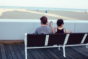 A tranquil scene unfolds as a couple relaxes on a bench overlooking the beach, bathed in soft natural light. Their relaxed posture and the gentle hues of the surrounding landscape evoke a mood of calm intimacy and shared contentment. The blurred figures in the background suggest a lively beach atmosphere, contrasting beautifully with the quiet moment between them.