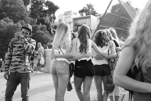 The photograph captures a lively moment where a group of young women embrace each other, their camaraderie evident as they stand side by side, backs to the camera. In contrast, a man in the foreground interrupts the scene with his casual demeanor, sipping from a cup, while the surrounding greenery and urban backdrop create a vibrant yet relaxed atmosphere. The black-and-white composition emphasizes the textures and emotions, evoking a sense of nostalgia and warmth among friends.