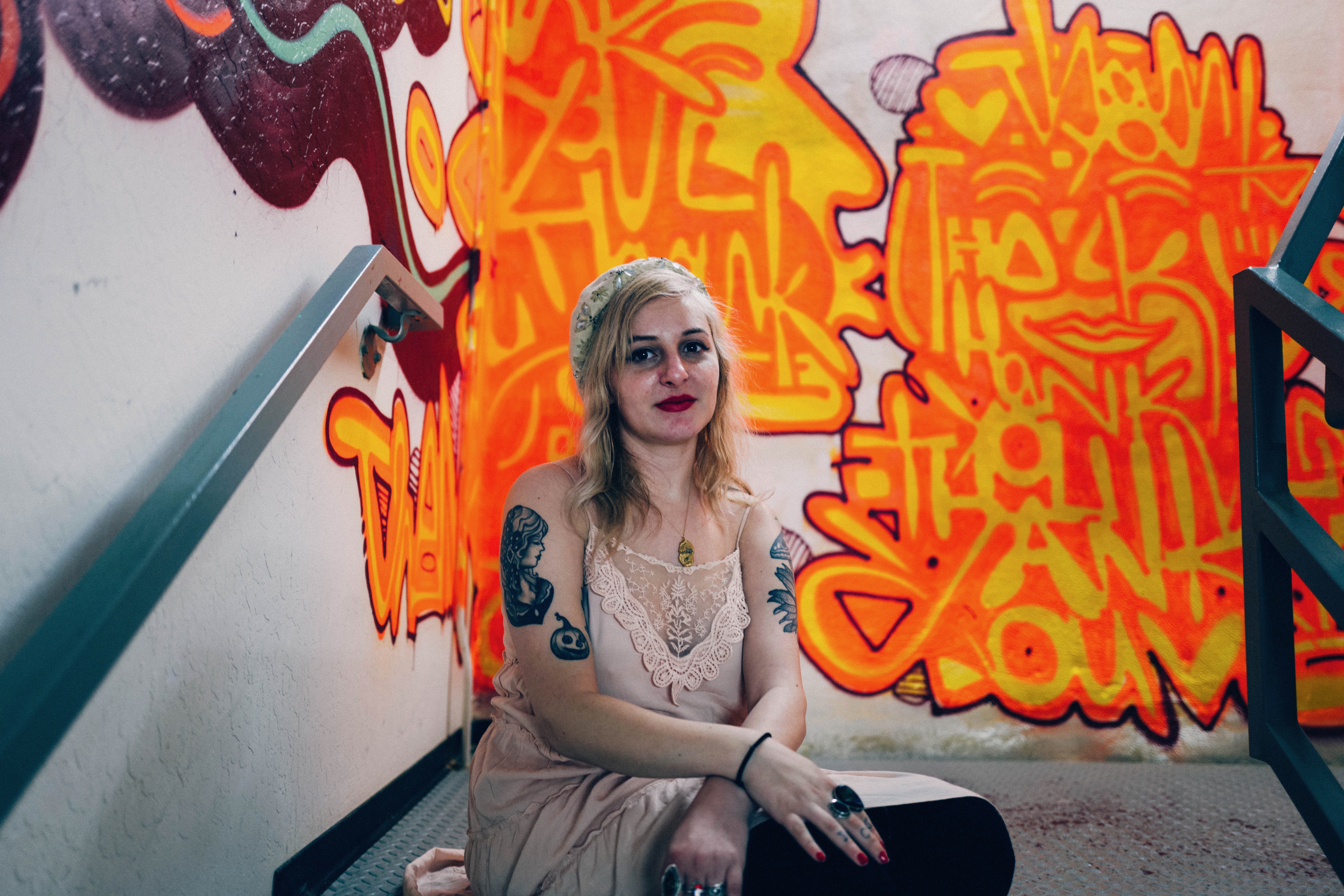 A young woman sits casually on a staircase, framed against a vibrant backdrop of graffiti in fiery orange and rich burgundy. Her expression is contemplative, contrasting against the energetic mural, while soft lighting highlights her features and the intricate details of her tattoos. The composition balances a sense of urban grit with a touch of intimate vulnerability.